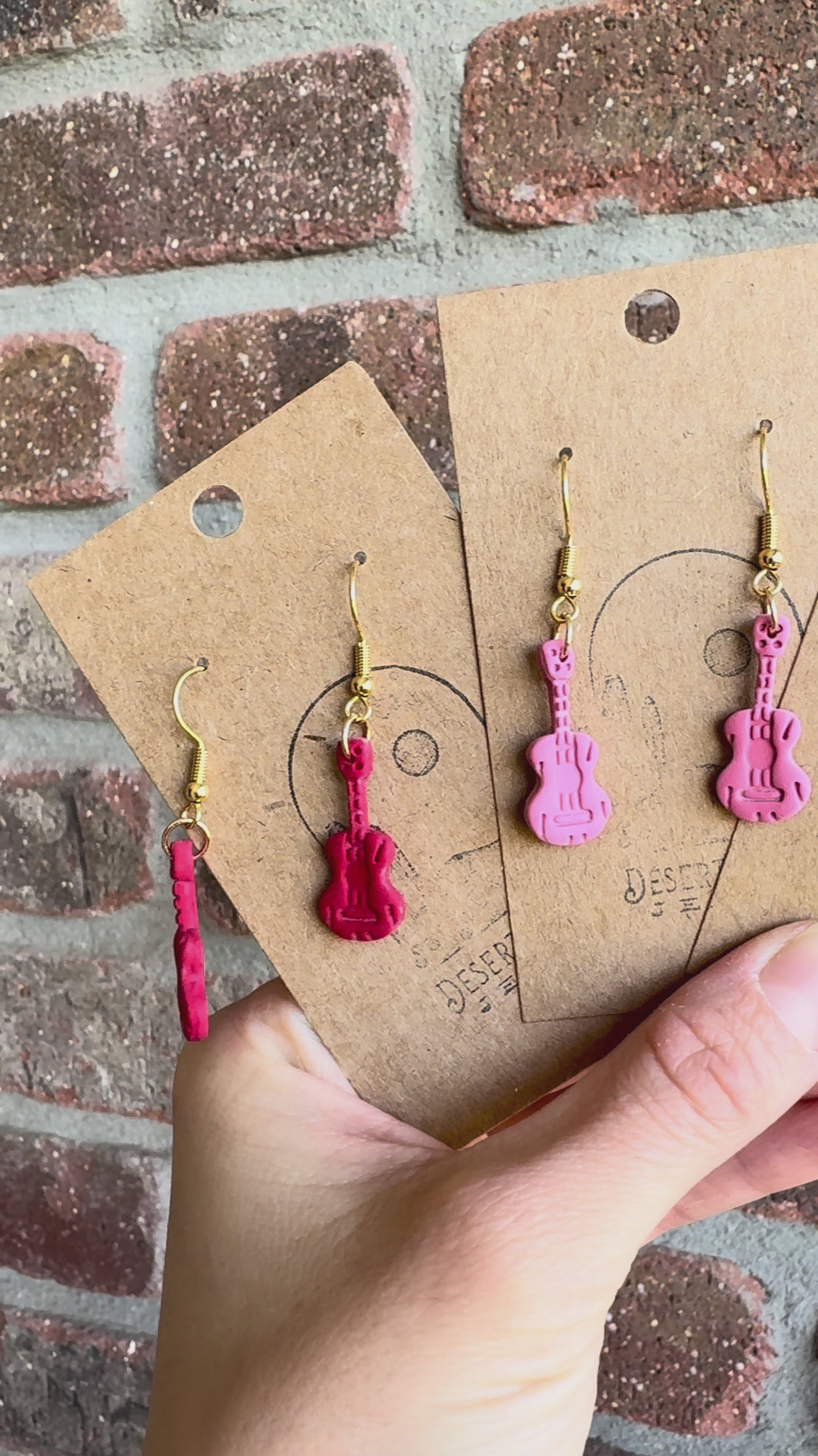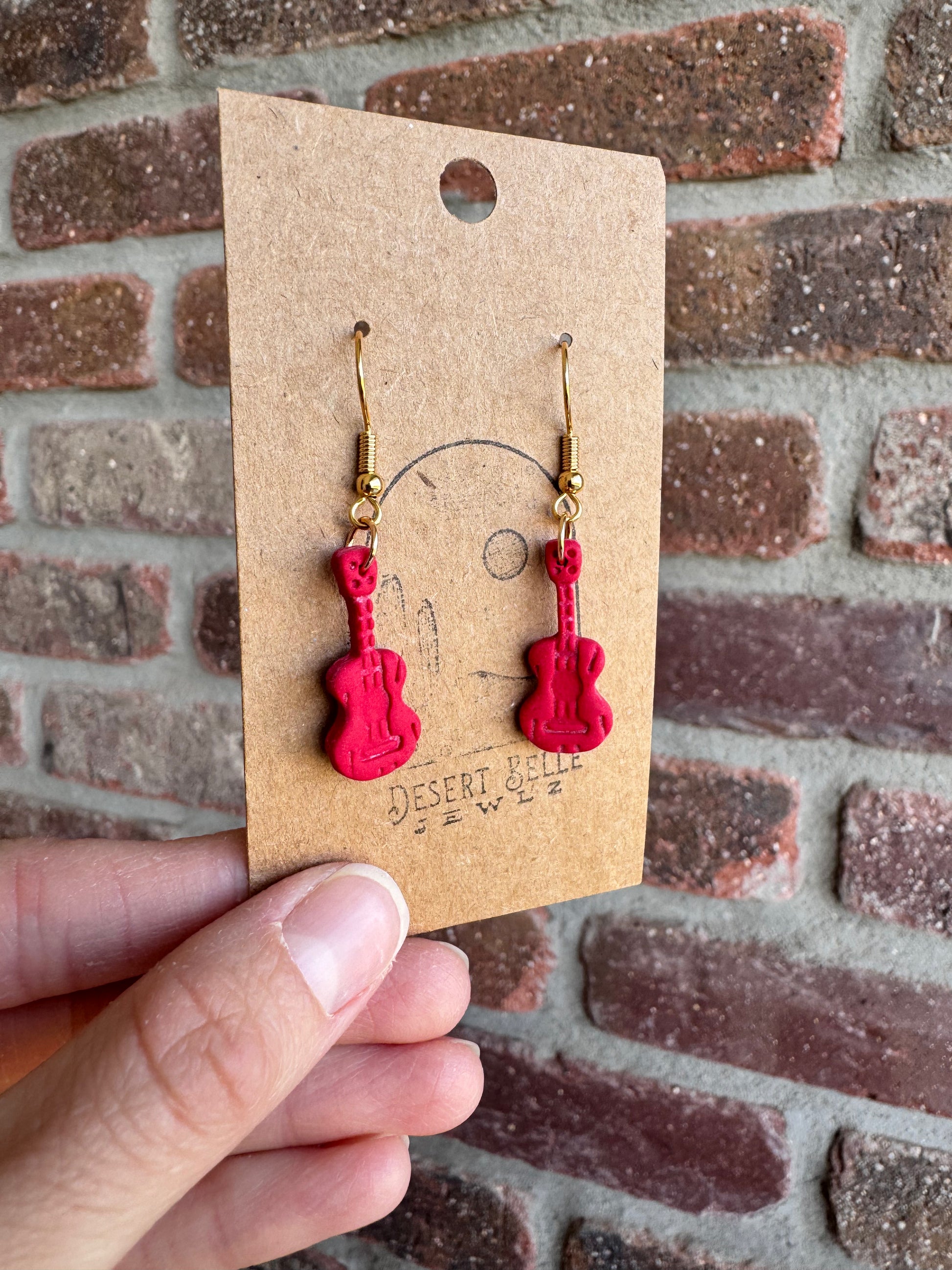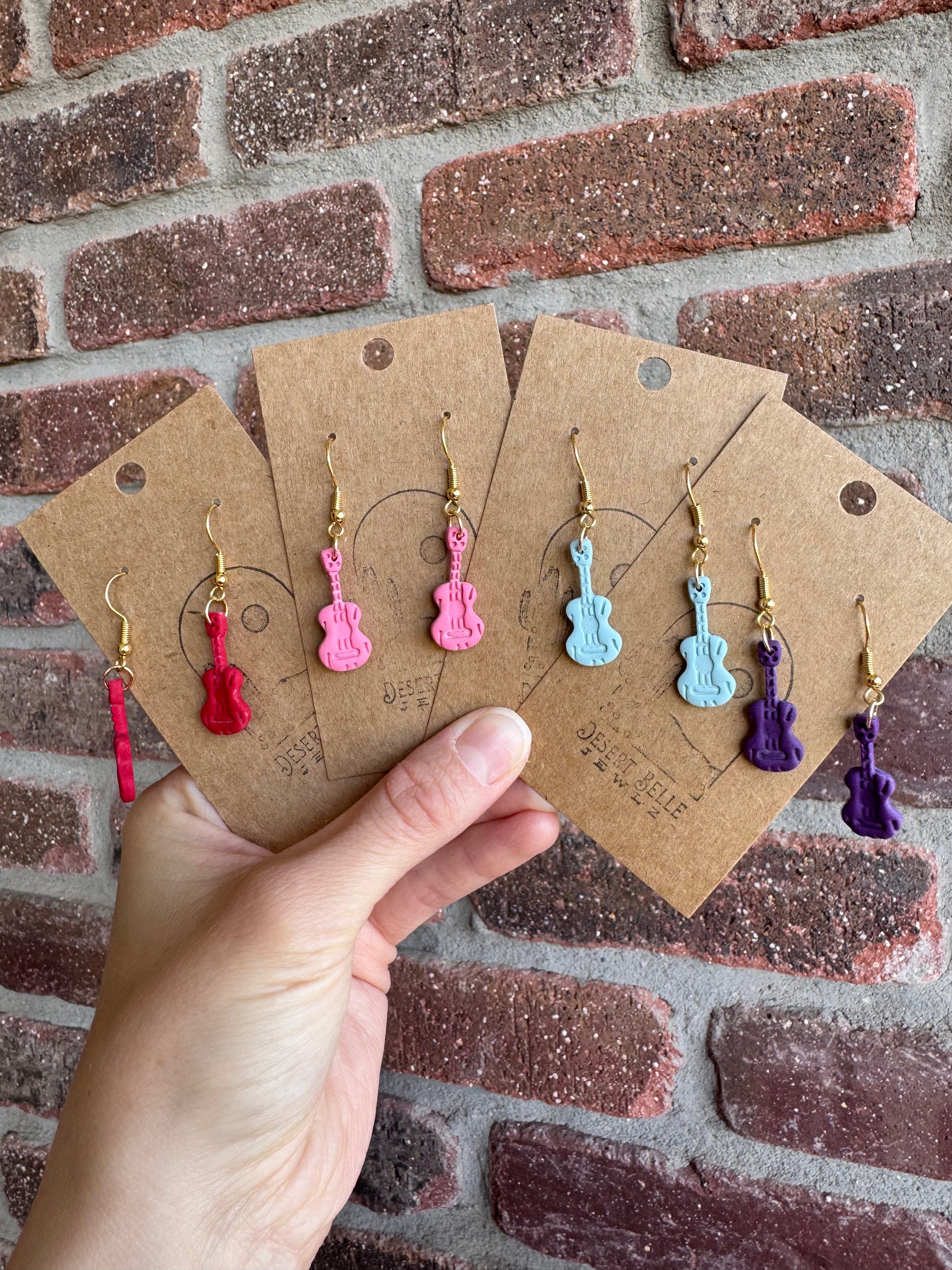 One-inch polymer clay ukuleles on surgical steel earring hooks. Message for color choice and choice of earring component type if you’d like a different earring hook than pictured.