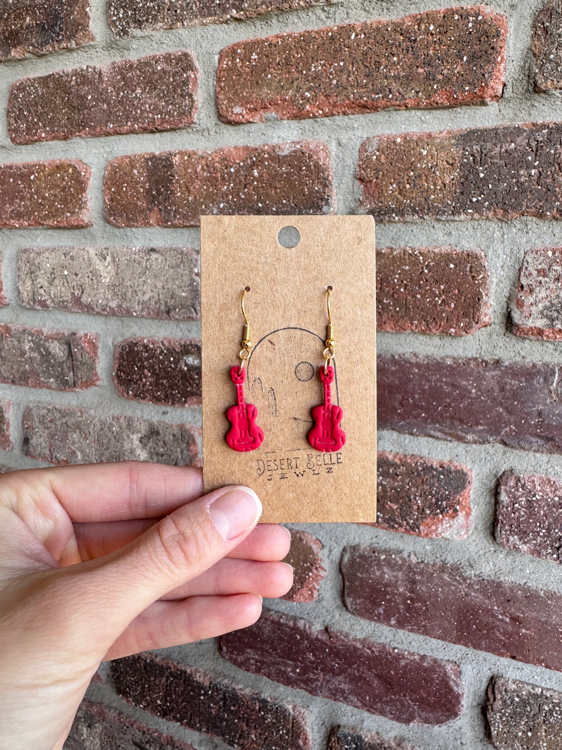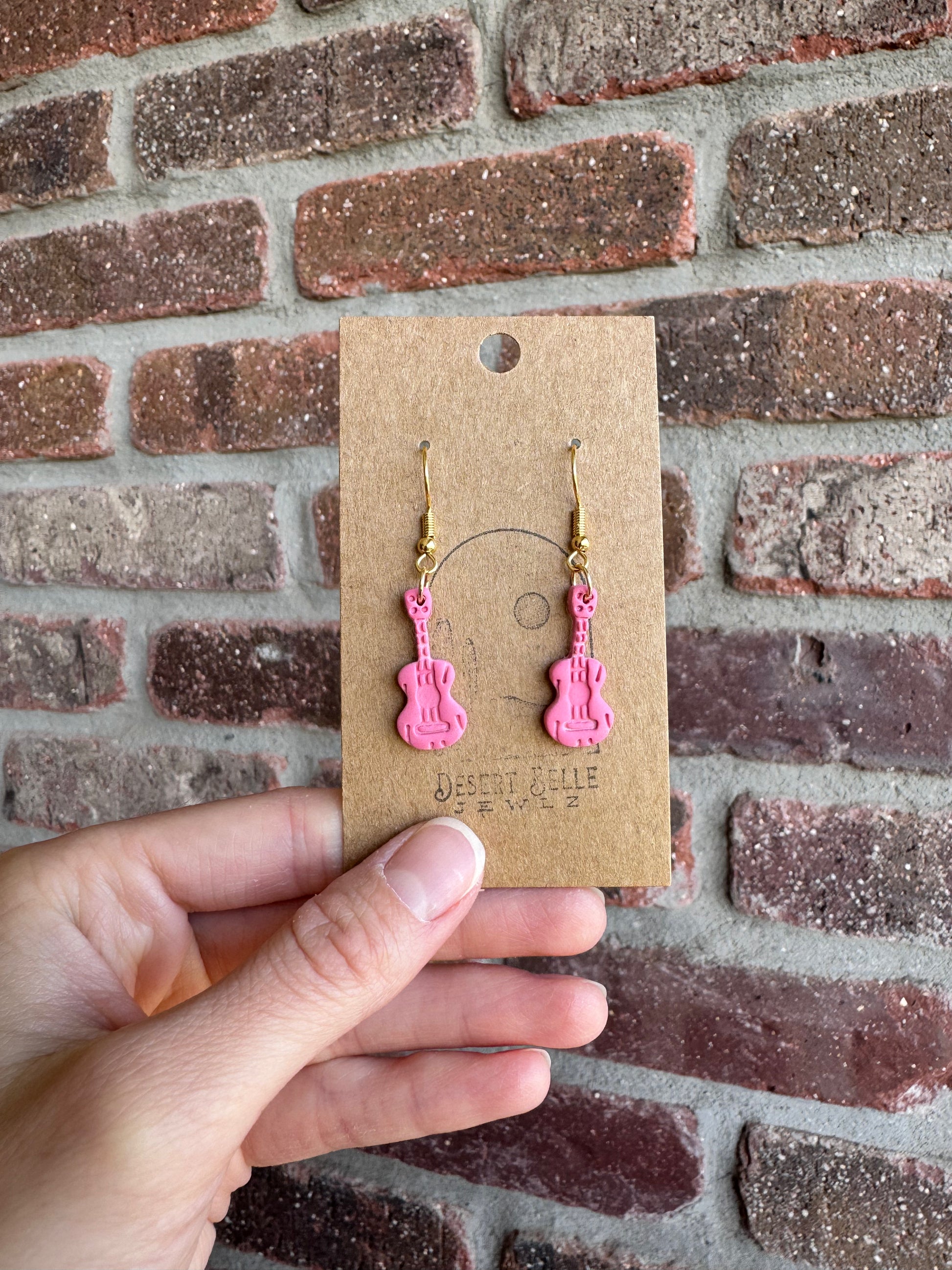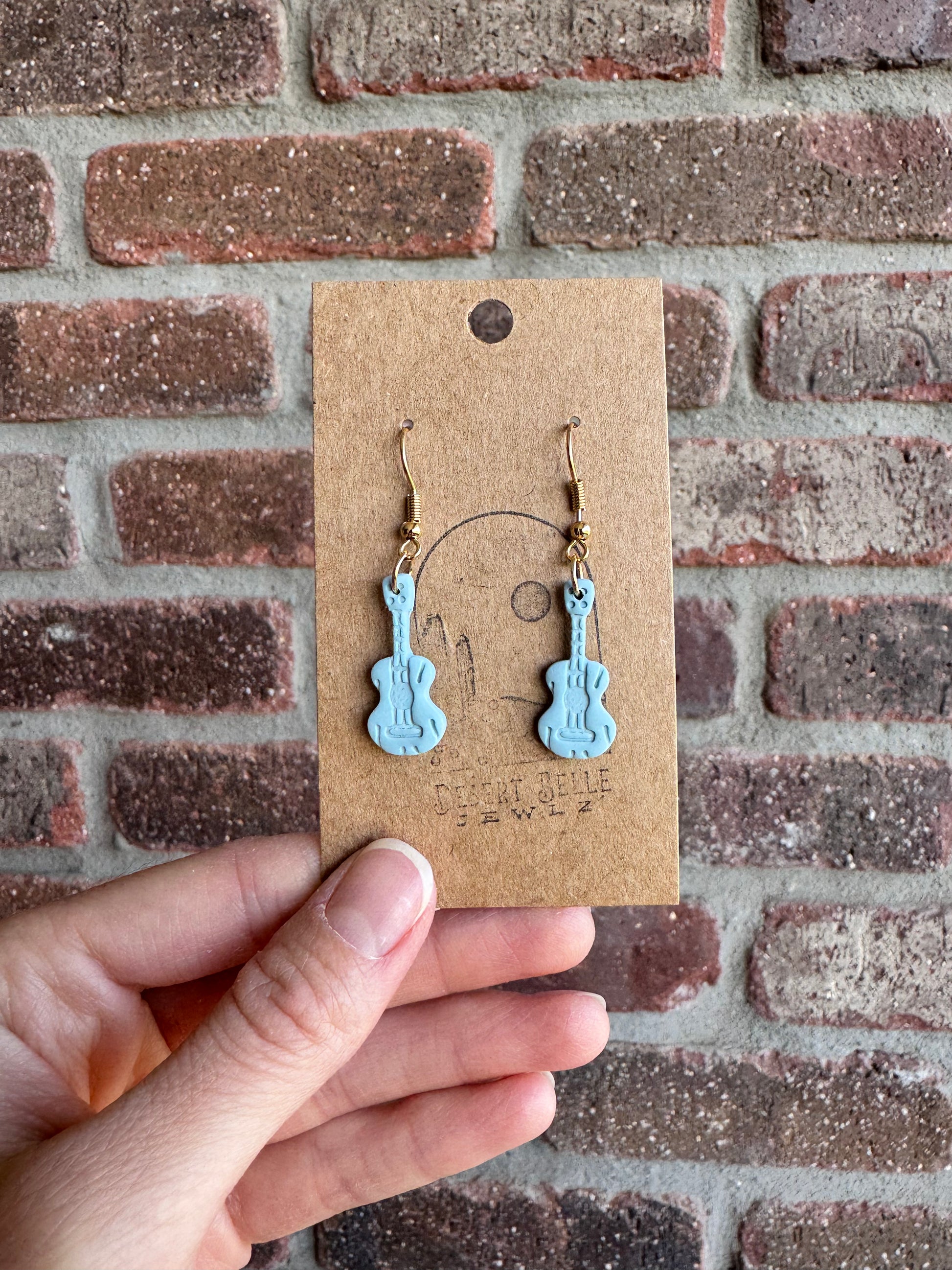 One-inch polymer clay ukuleles on surgical steel earring hooks. Message for color choice and choice of earring component type if you’d like a different earring hook than pictured.