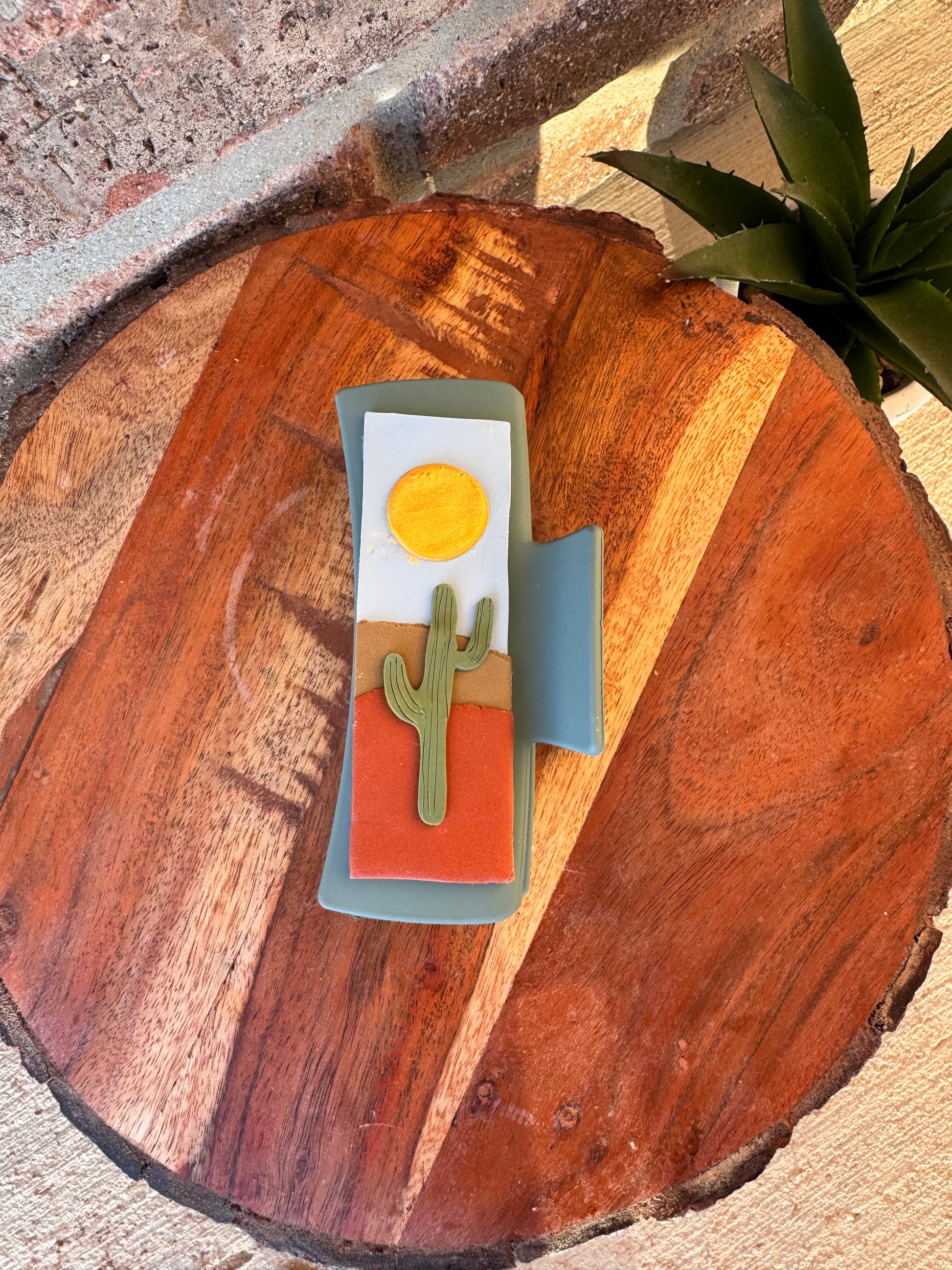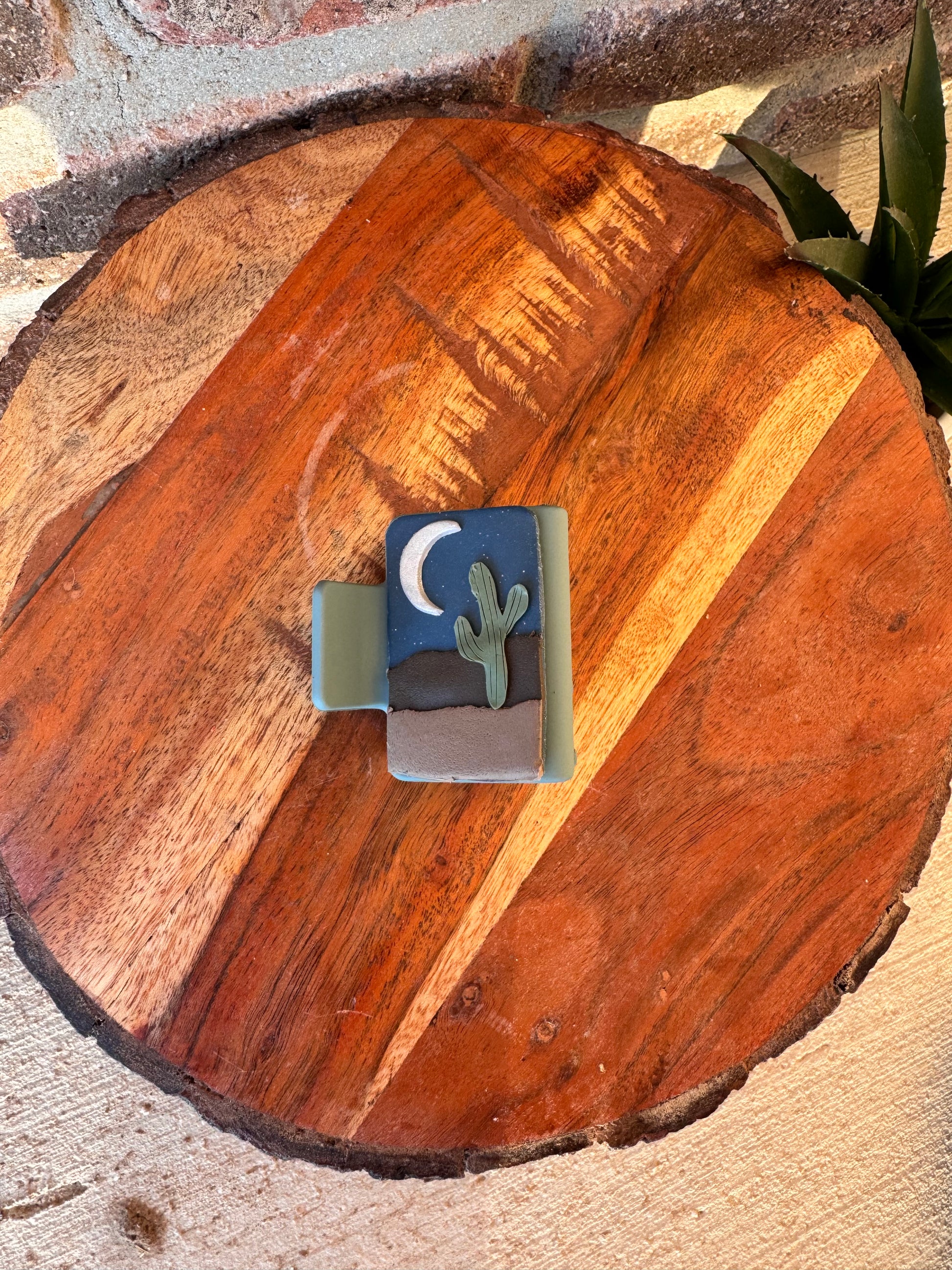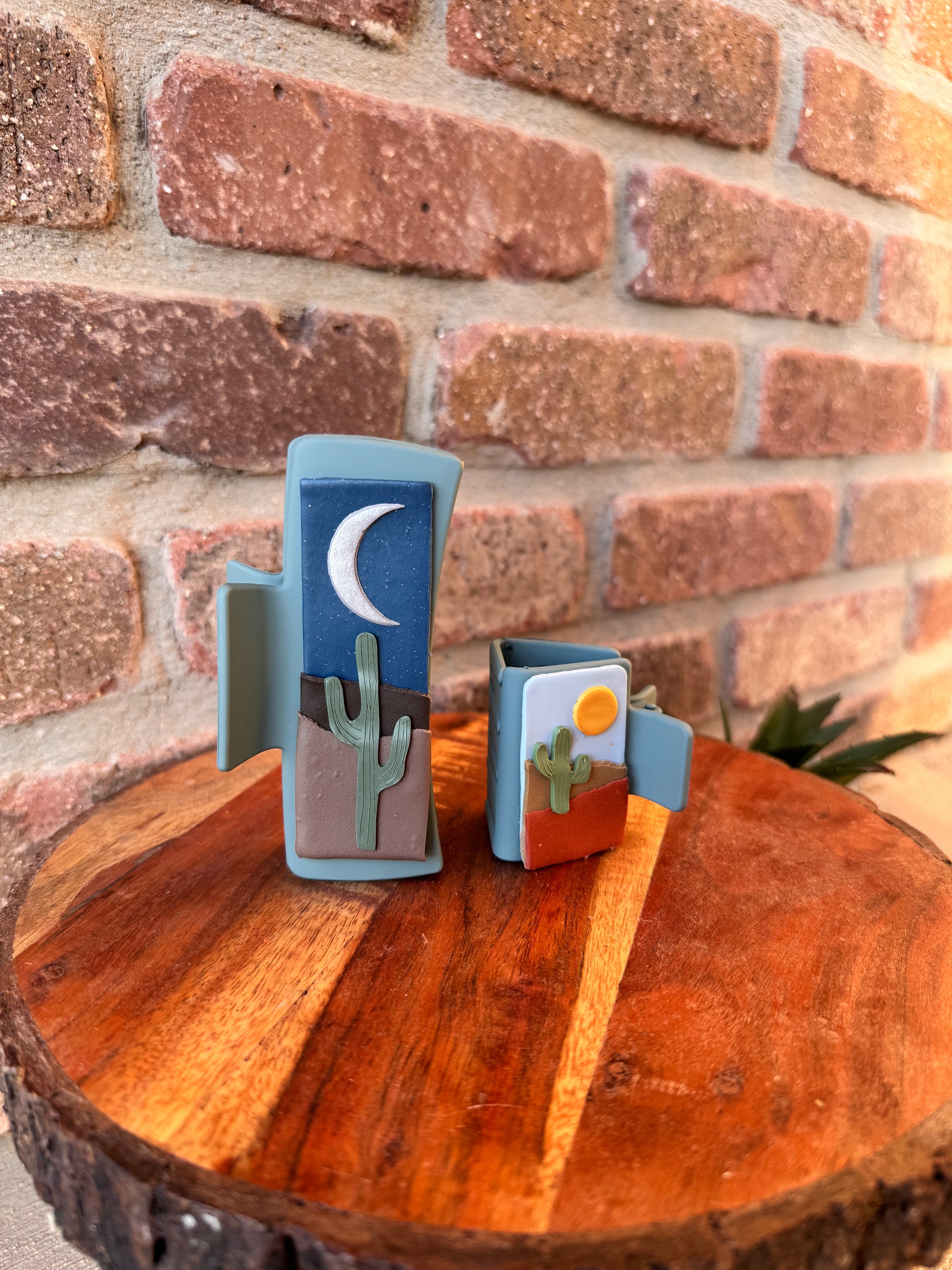 Claw clips embellished with handcrafted clay desert scenery. One side of the clip is the daytime scene while the other side is the night.