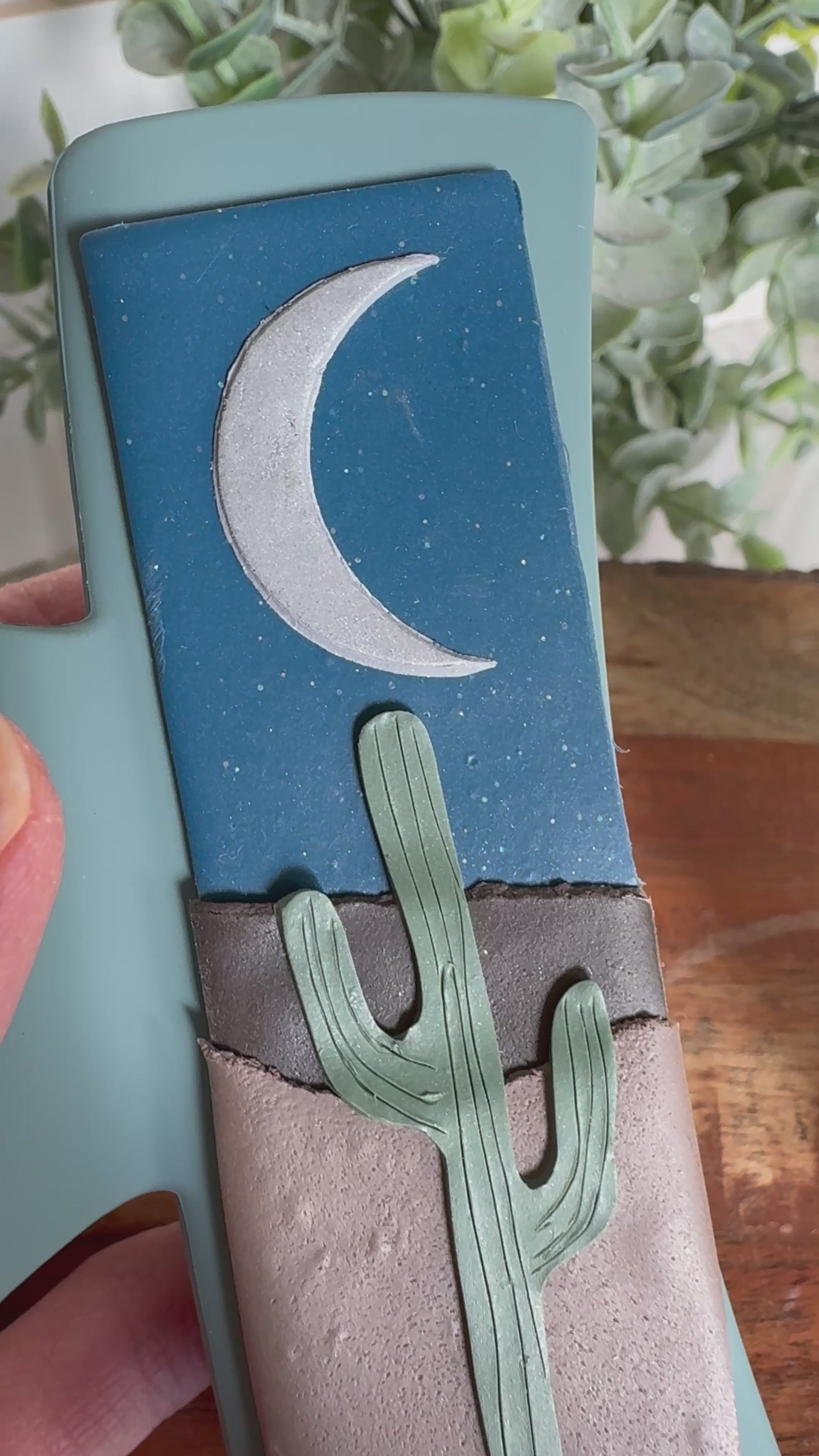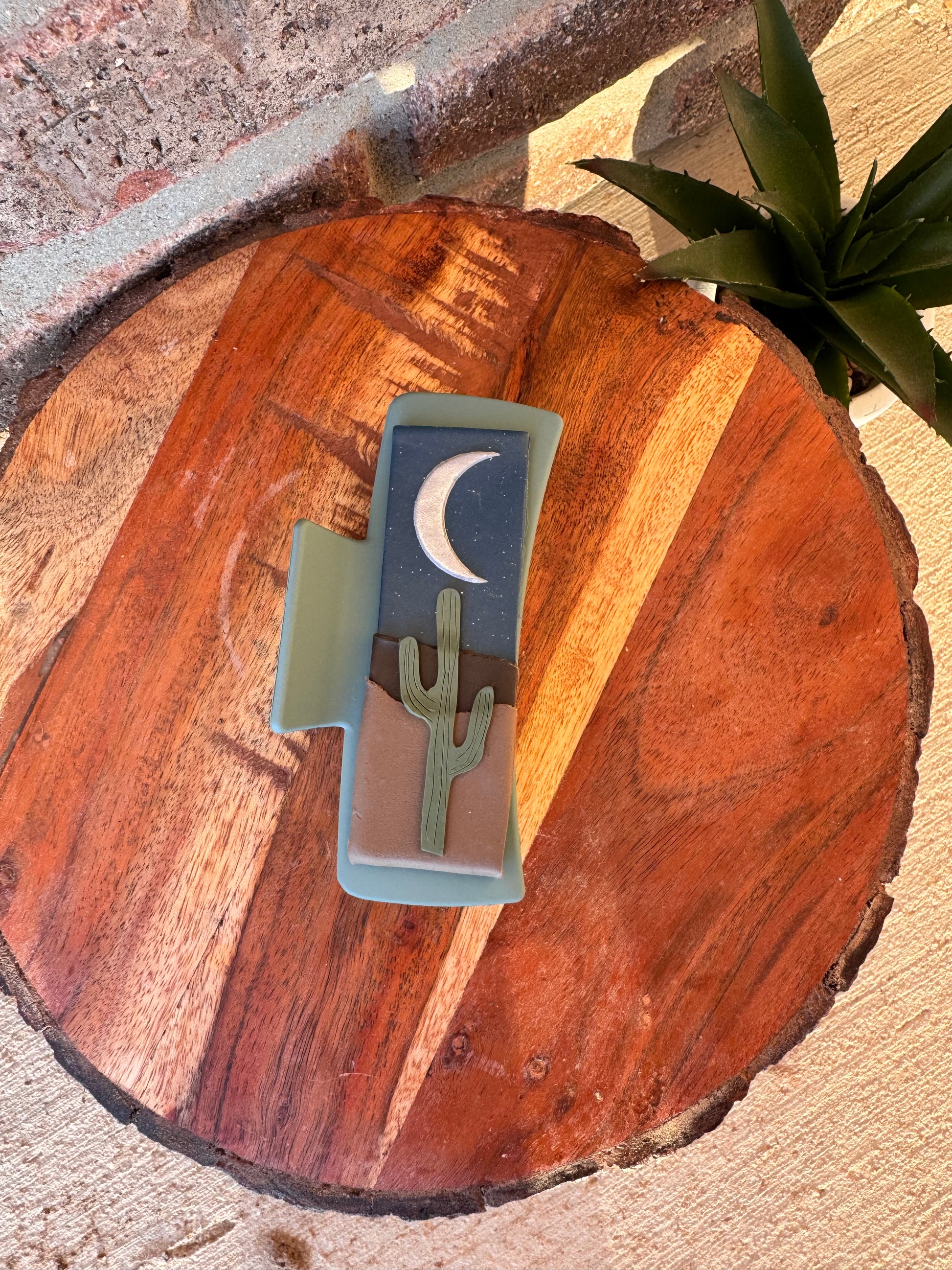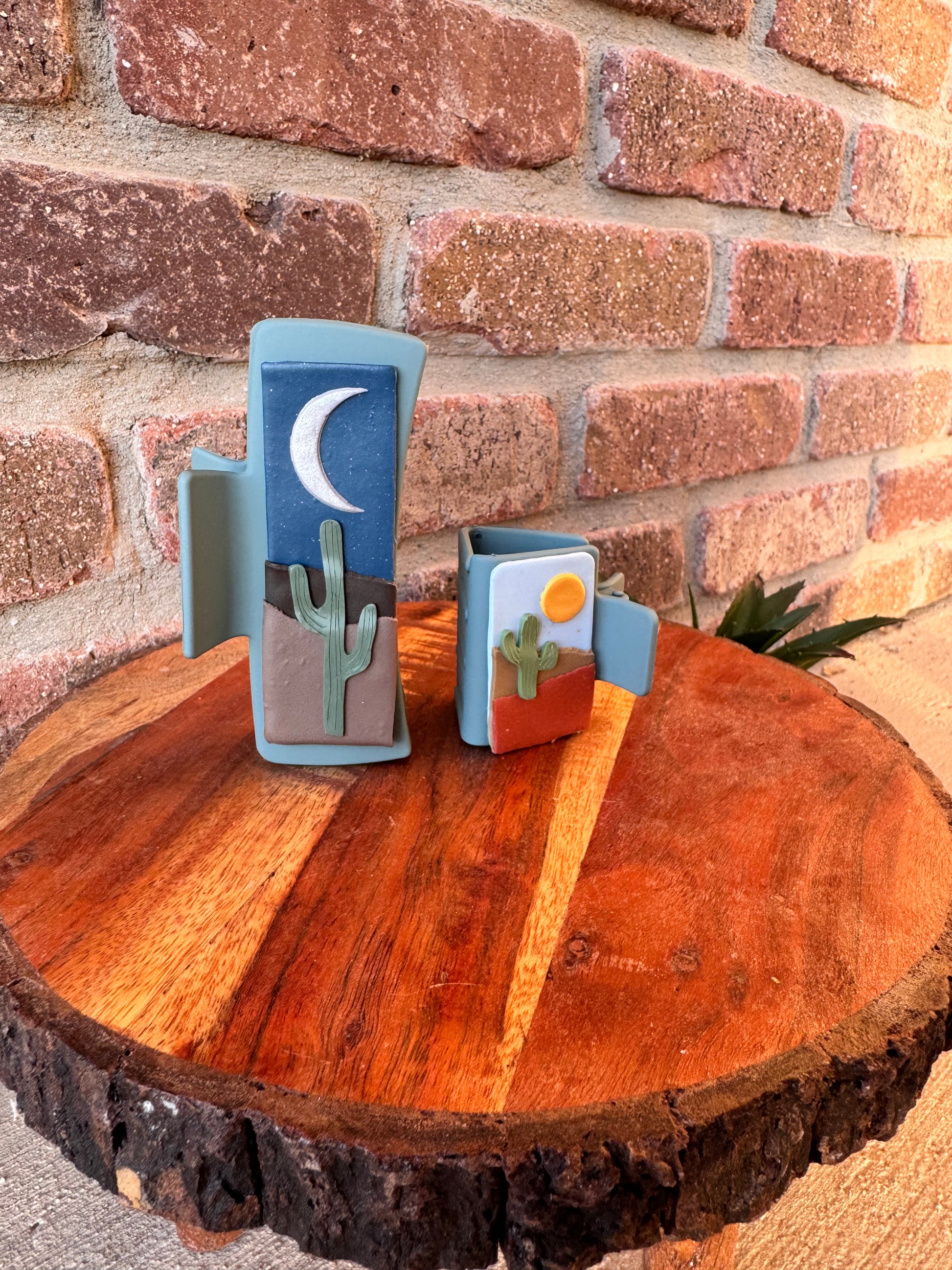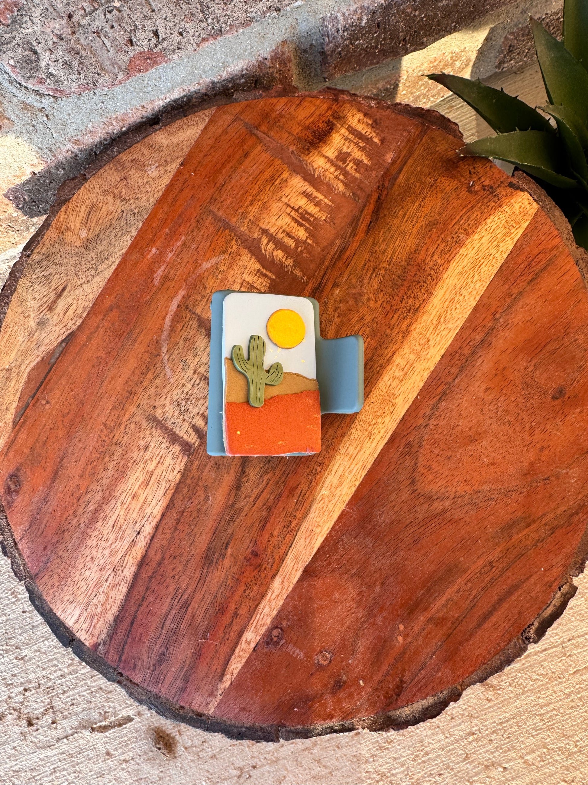 Claw clips embellished with handcrafted clay desert scenery. One side of the clip is the daytime scene while the other side is the night.