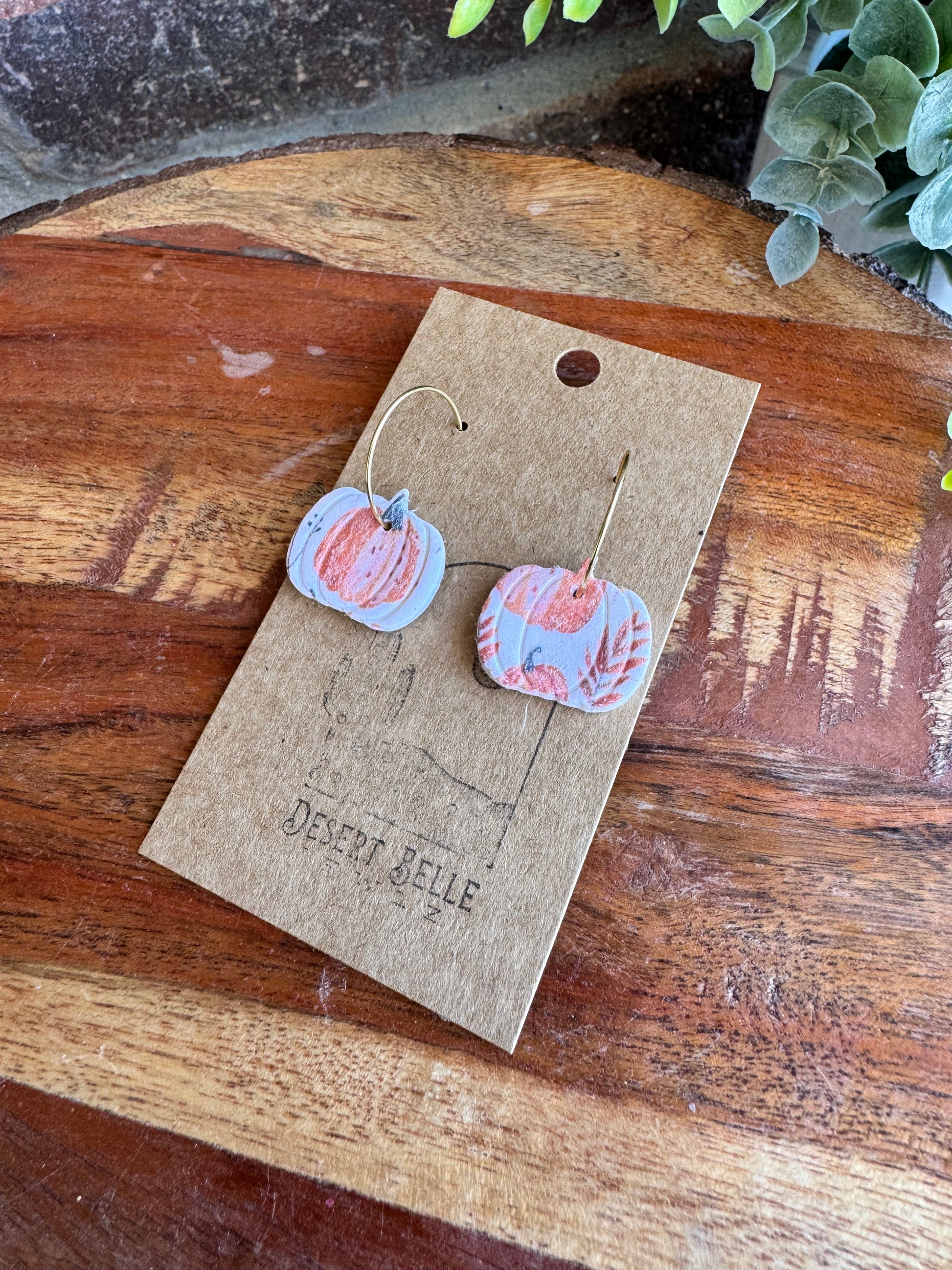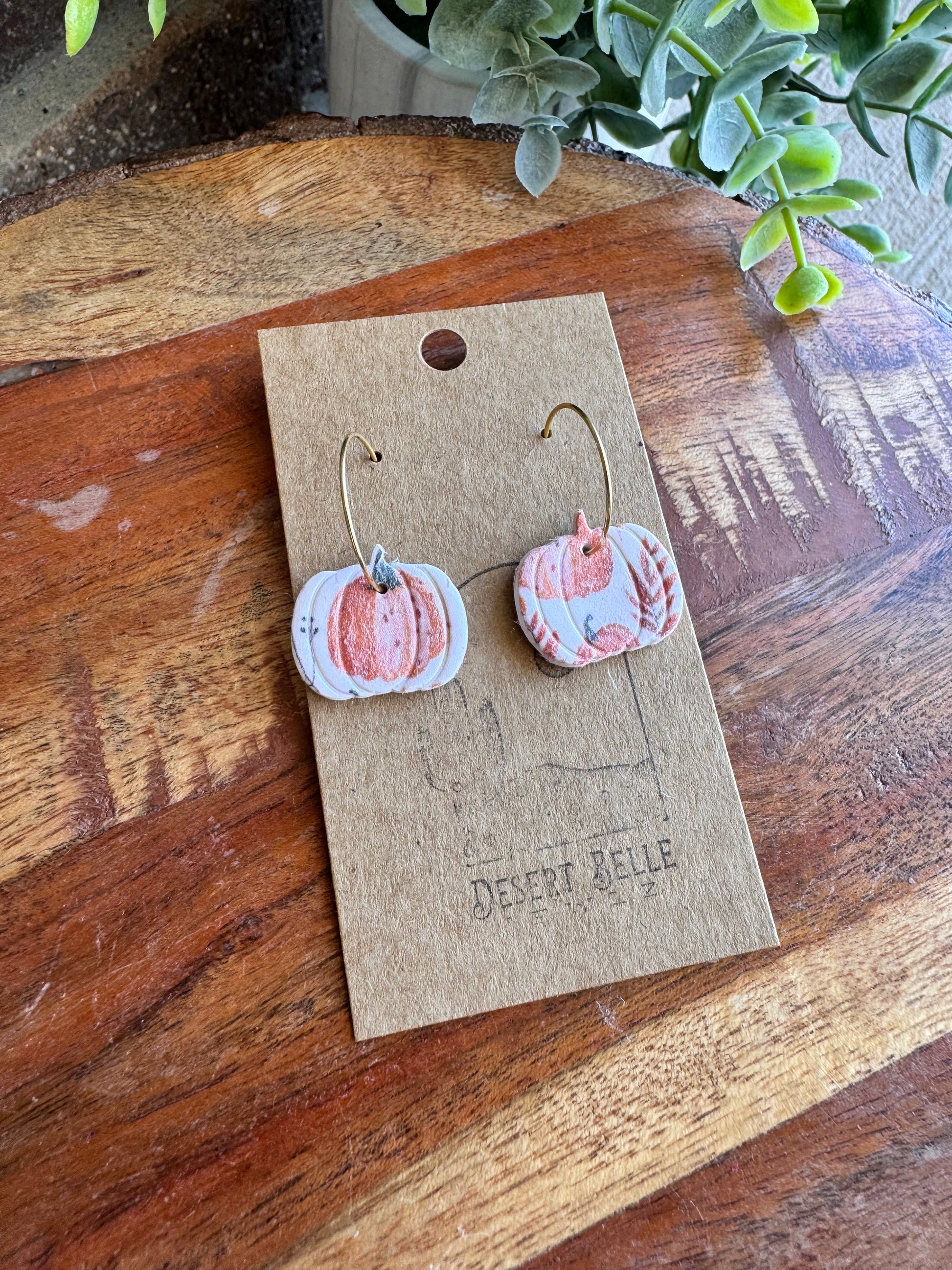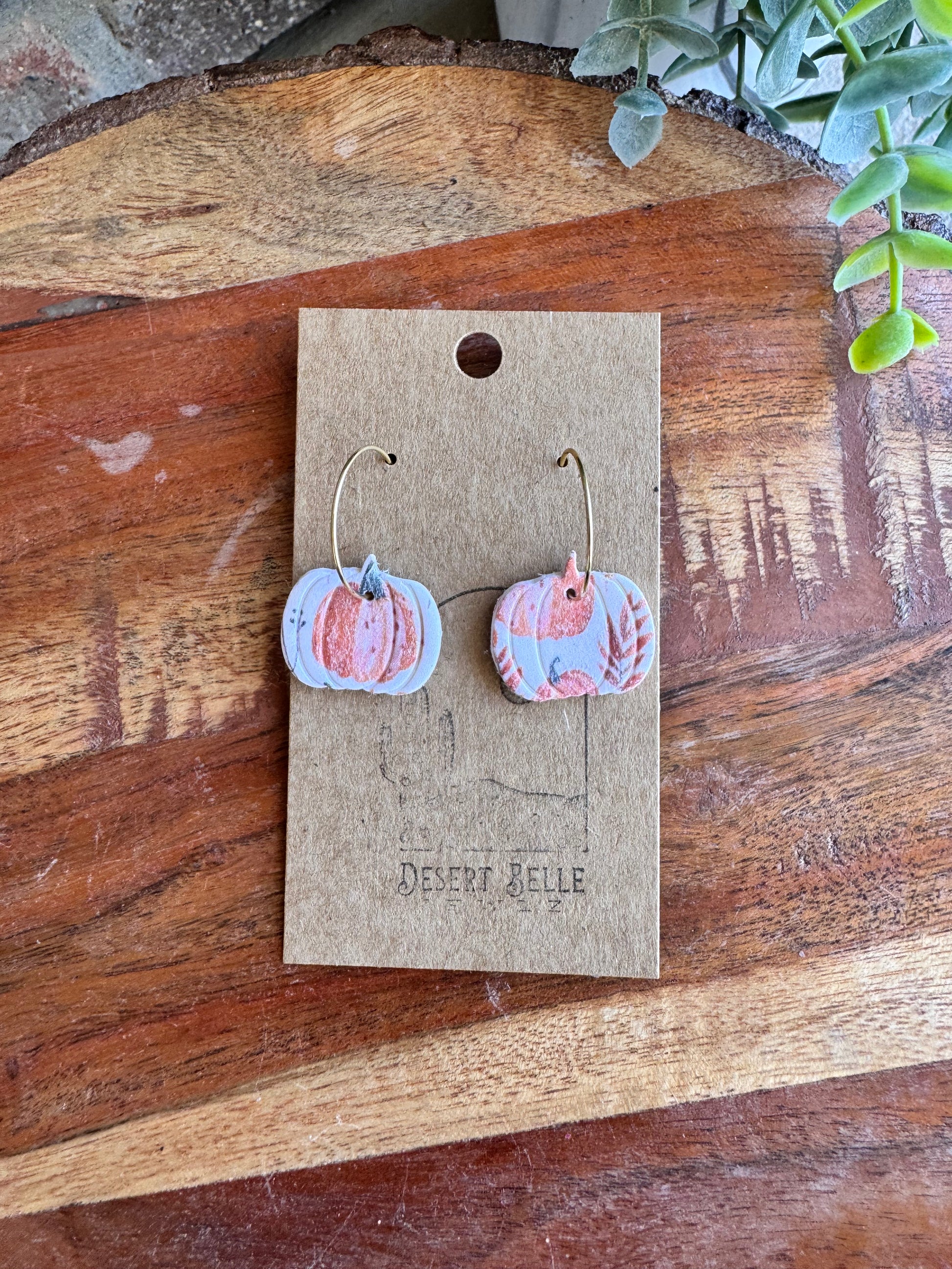 Polymer clay pumpkins in a fall pumpkin print. They are on stainless steel hoops.