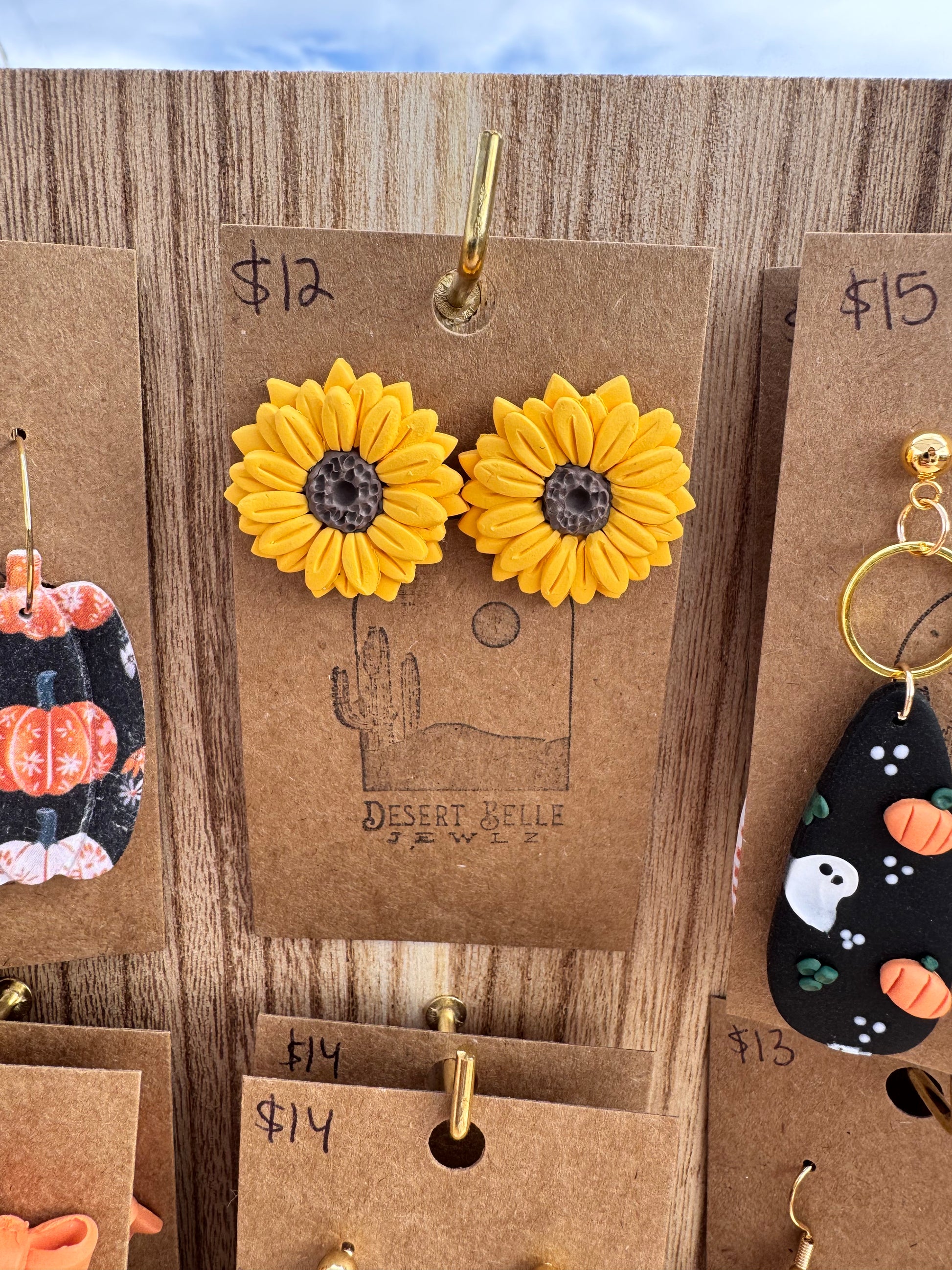 Polymer clay sunflower studs on 316 surgical steel posts.