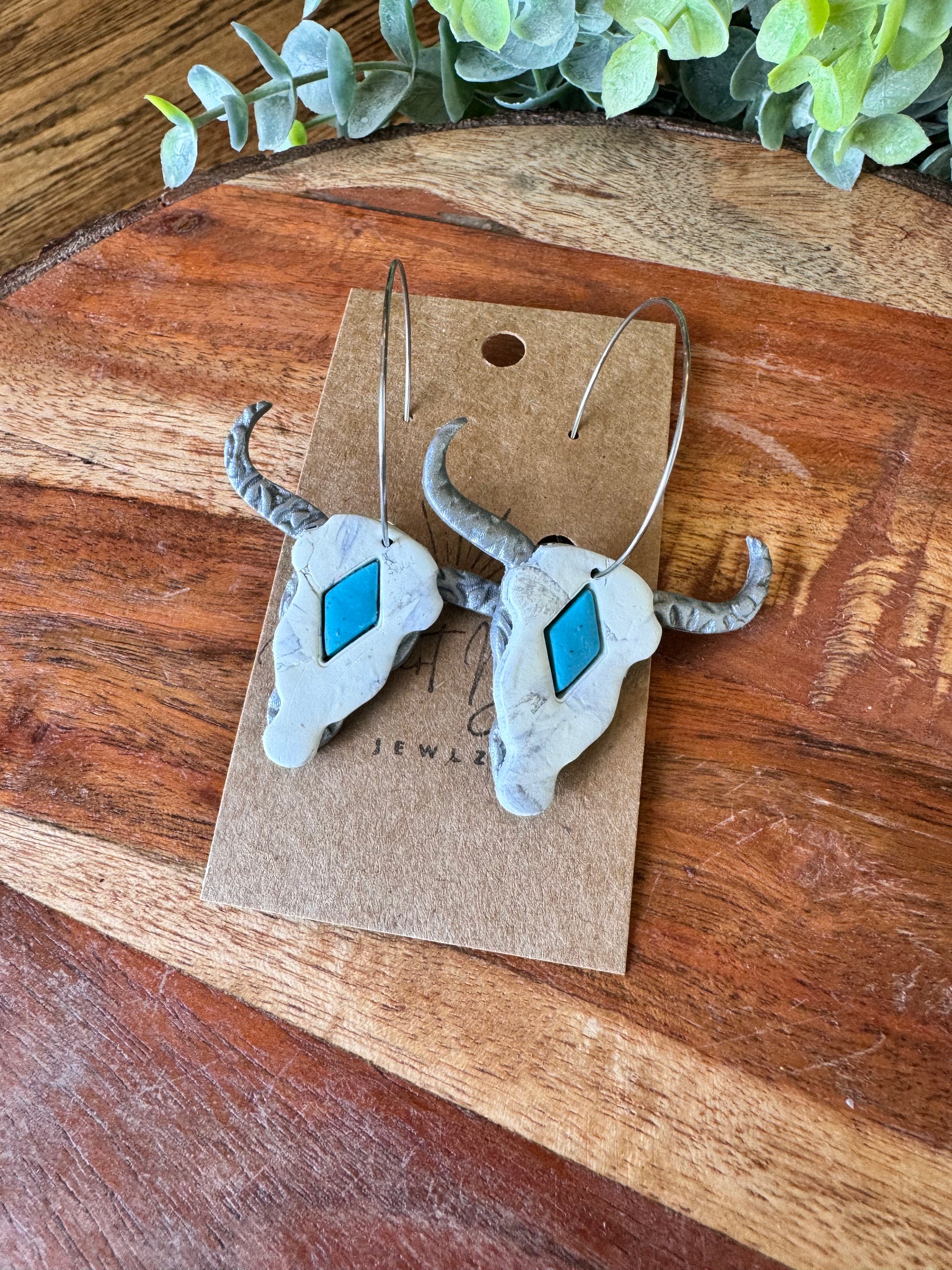 Longhorn hoops with an ivory marble face, textruded silver horns, and a turquoise diamond on the face. On stainless steel hoops.