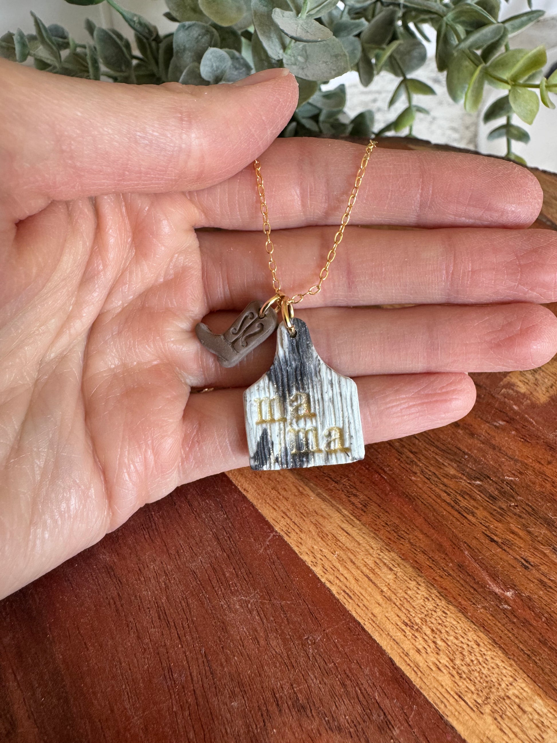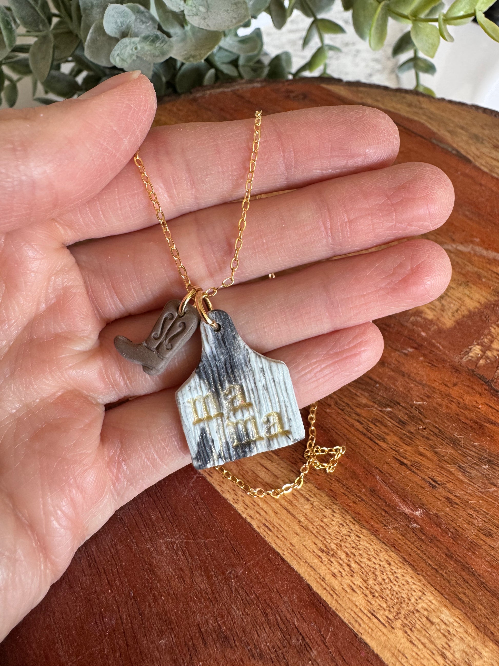 A polymer clay cow print cow tag shaped charm stamped with gold letters that read “mama”. A small brown clay cowboy boot charm sits next to the cow tag charm. This necklace is on an 18 inch 16k gold plated brass diamond cut chain.