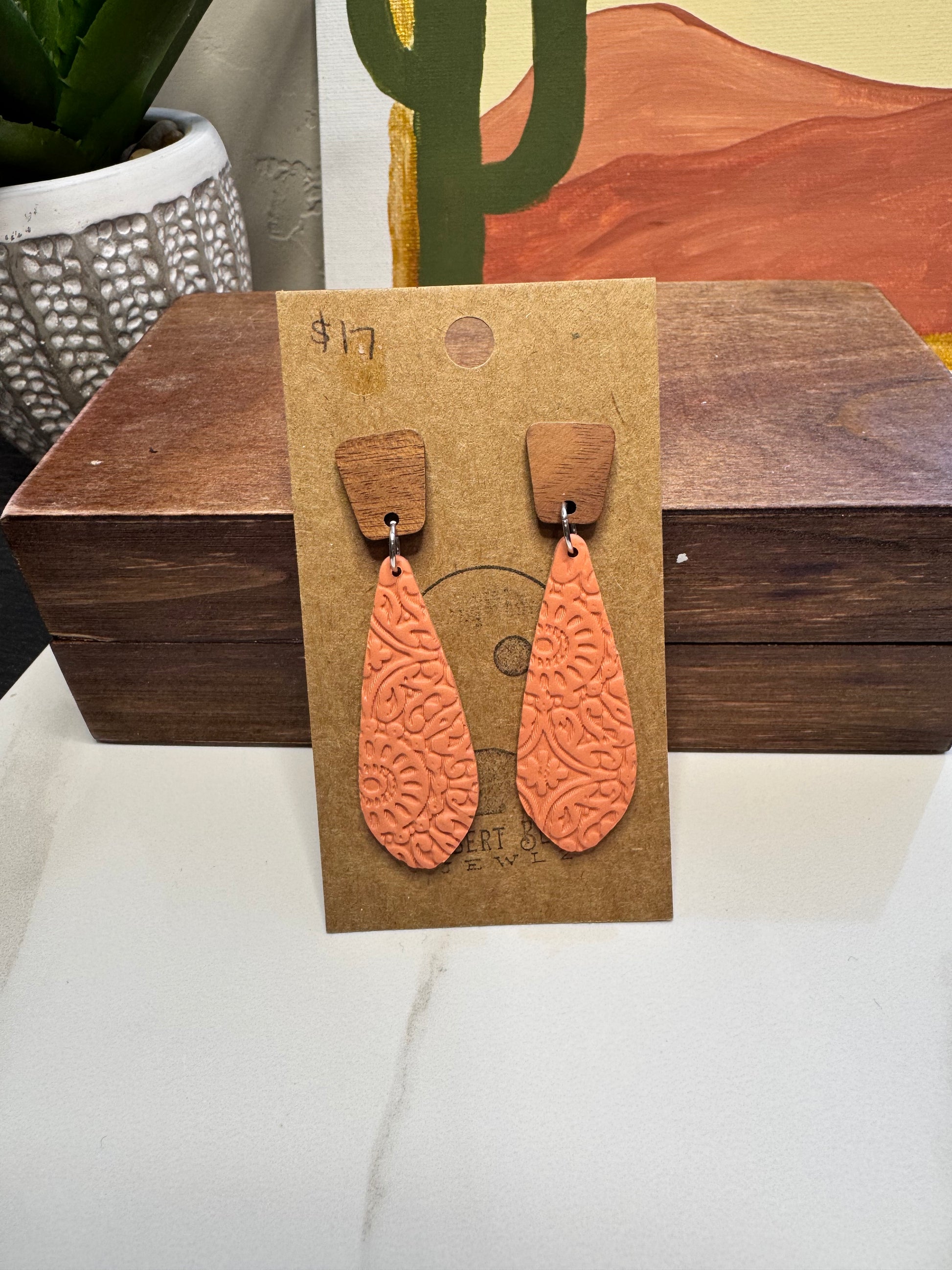 Textured terracotta colored earrings with wood stud toppers. Stainless steel posts.