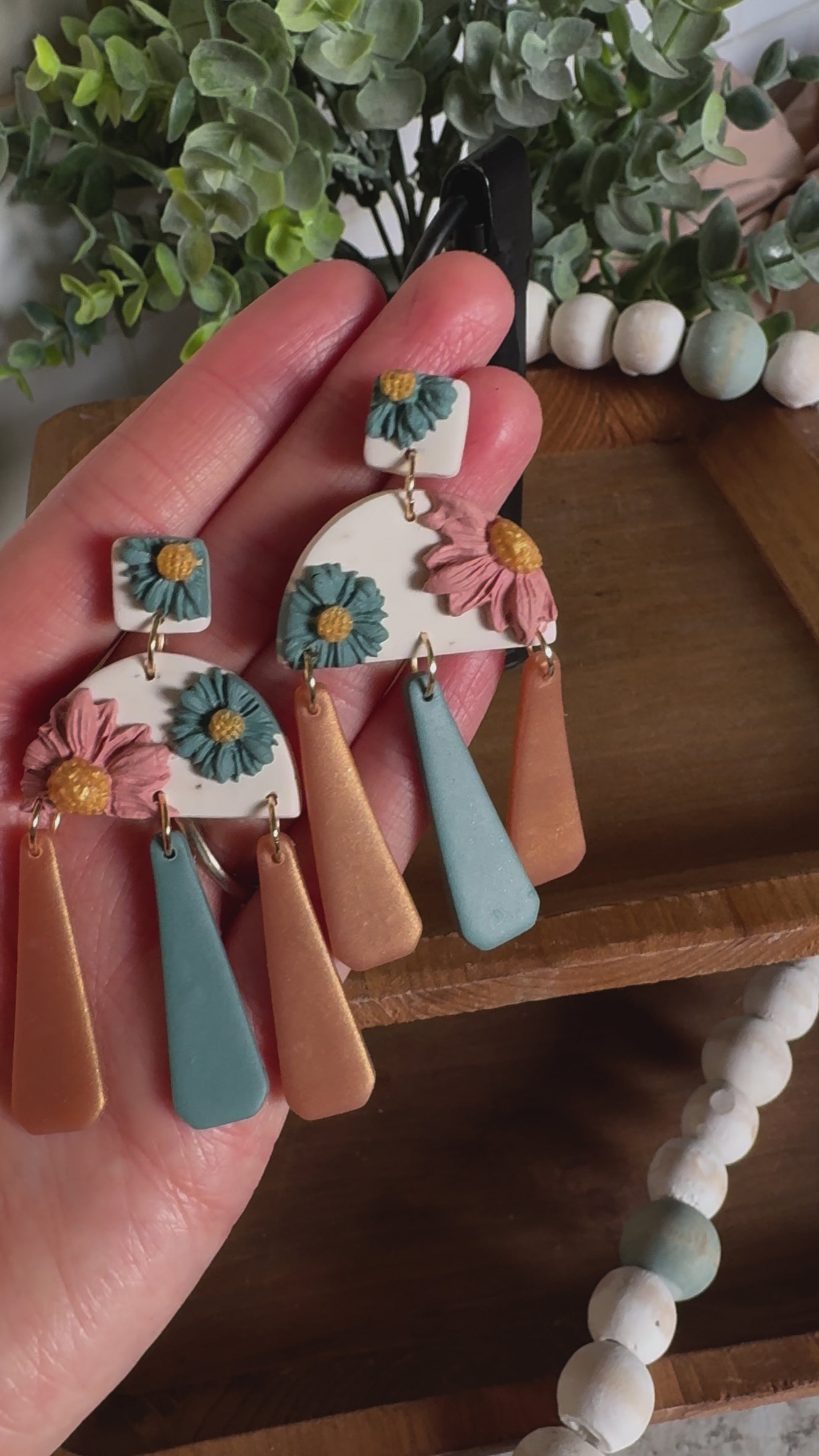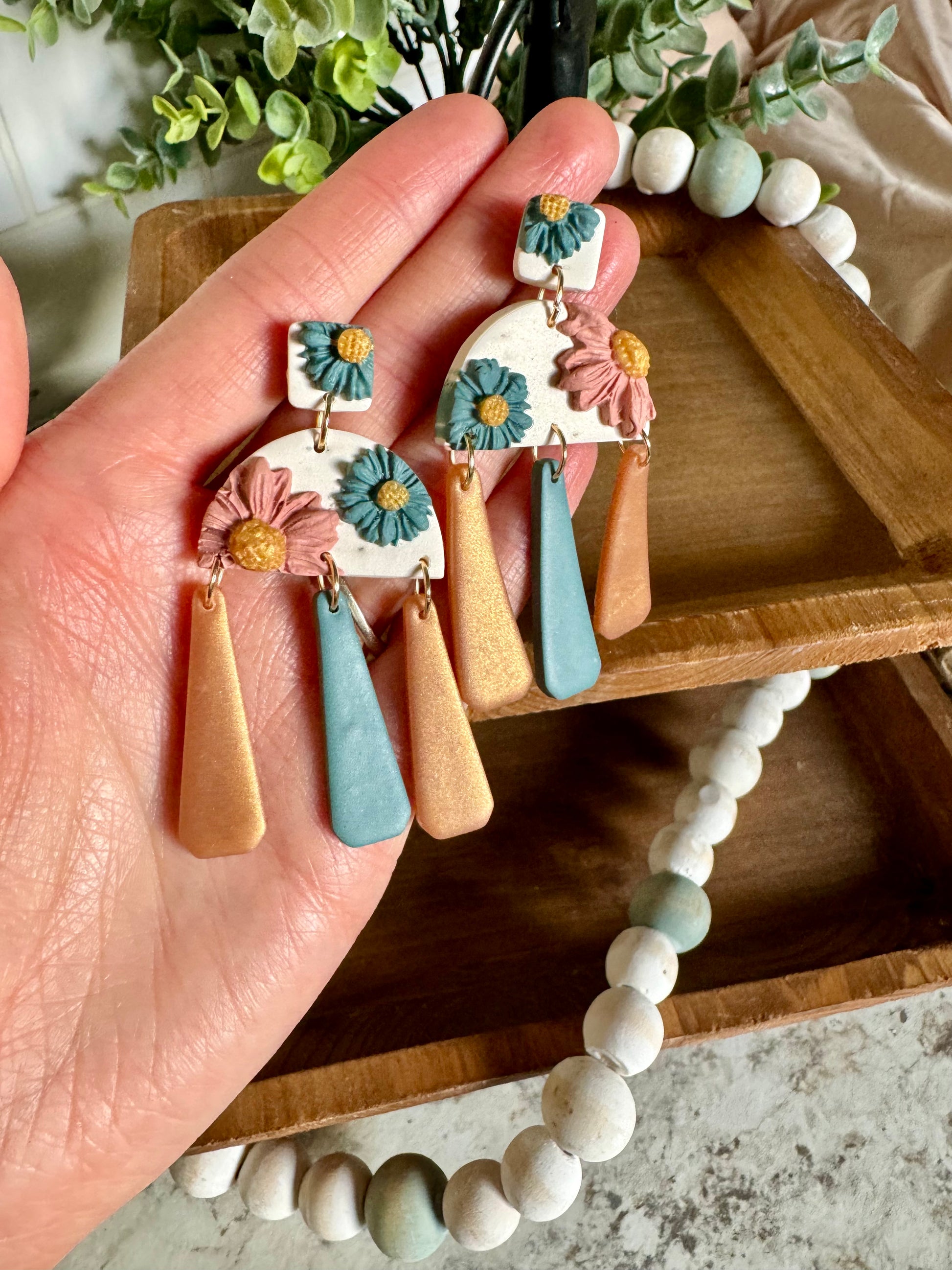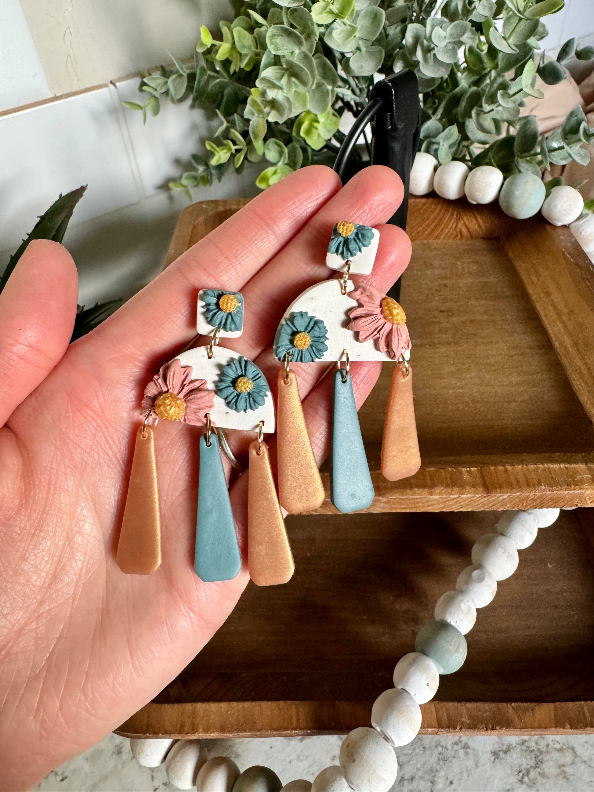 Pretty floral dangles in an ivory, dusty blue, and blush color scheme. On stainless steel posts.