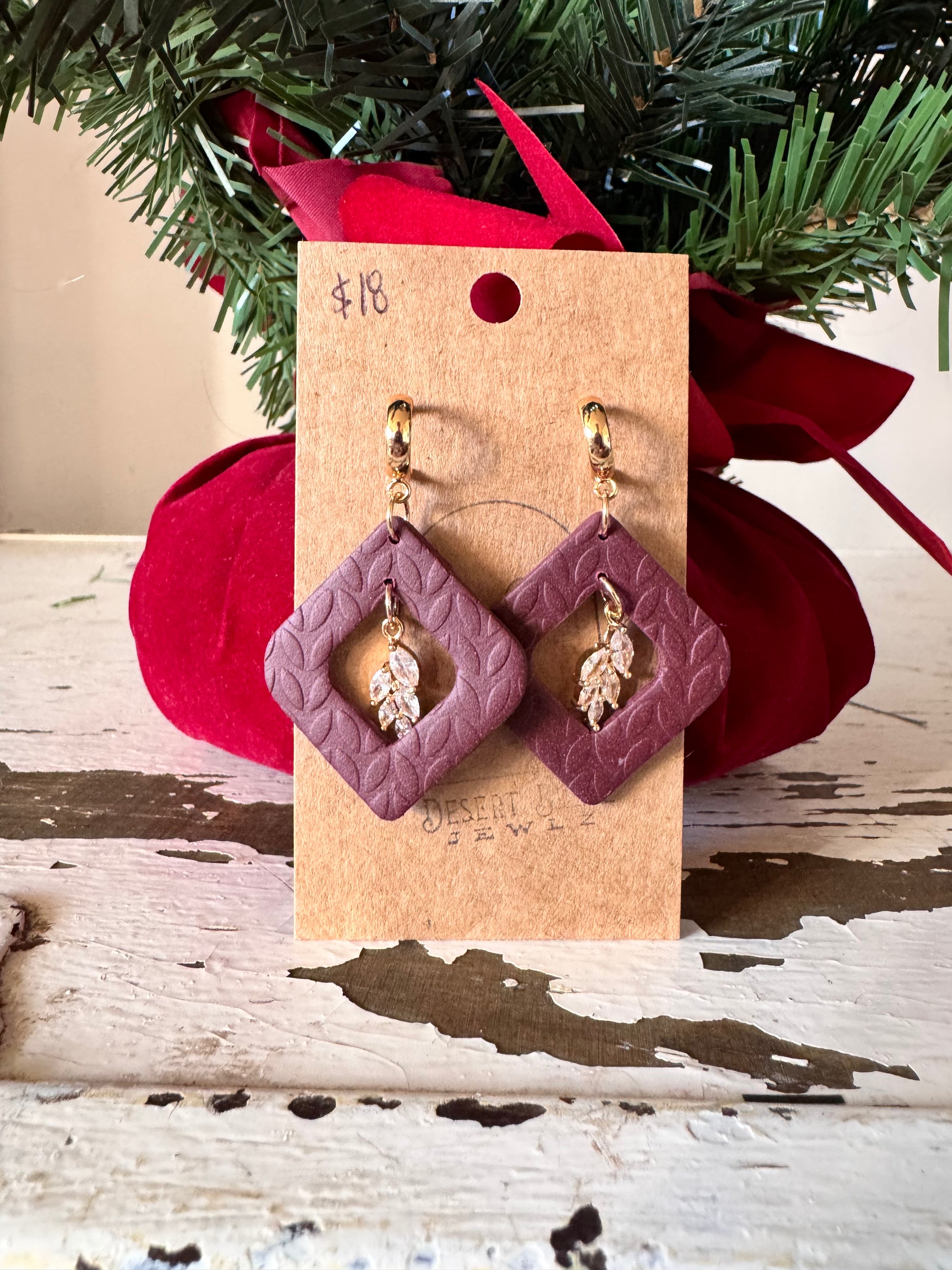Pretty maroon clay earrings in a knit texture featuring a cubic zirconia charm. On stainless steel huggie studs.