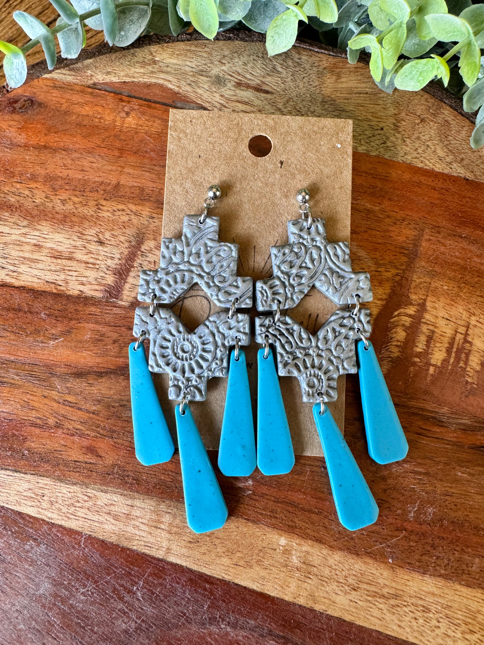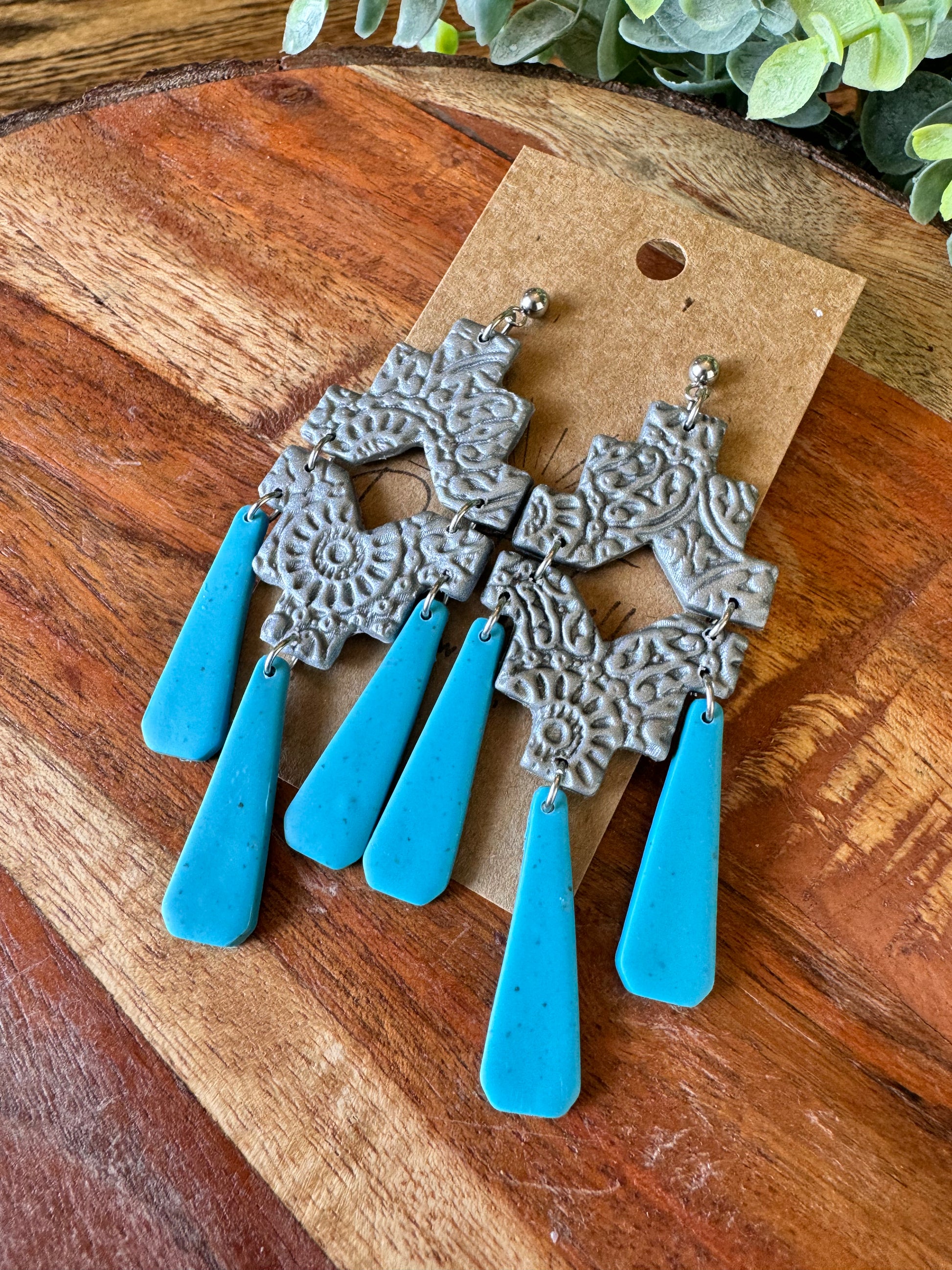 Southwestern style clay statment earrings in a textured silver with turquoise. Stainless steel ball posts.