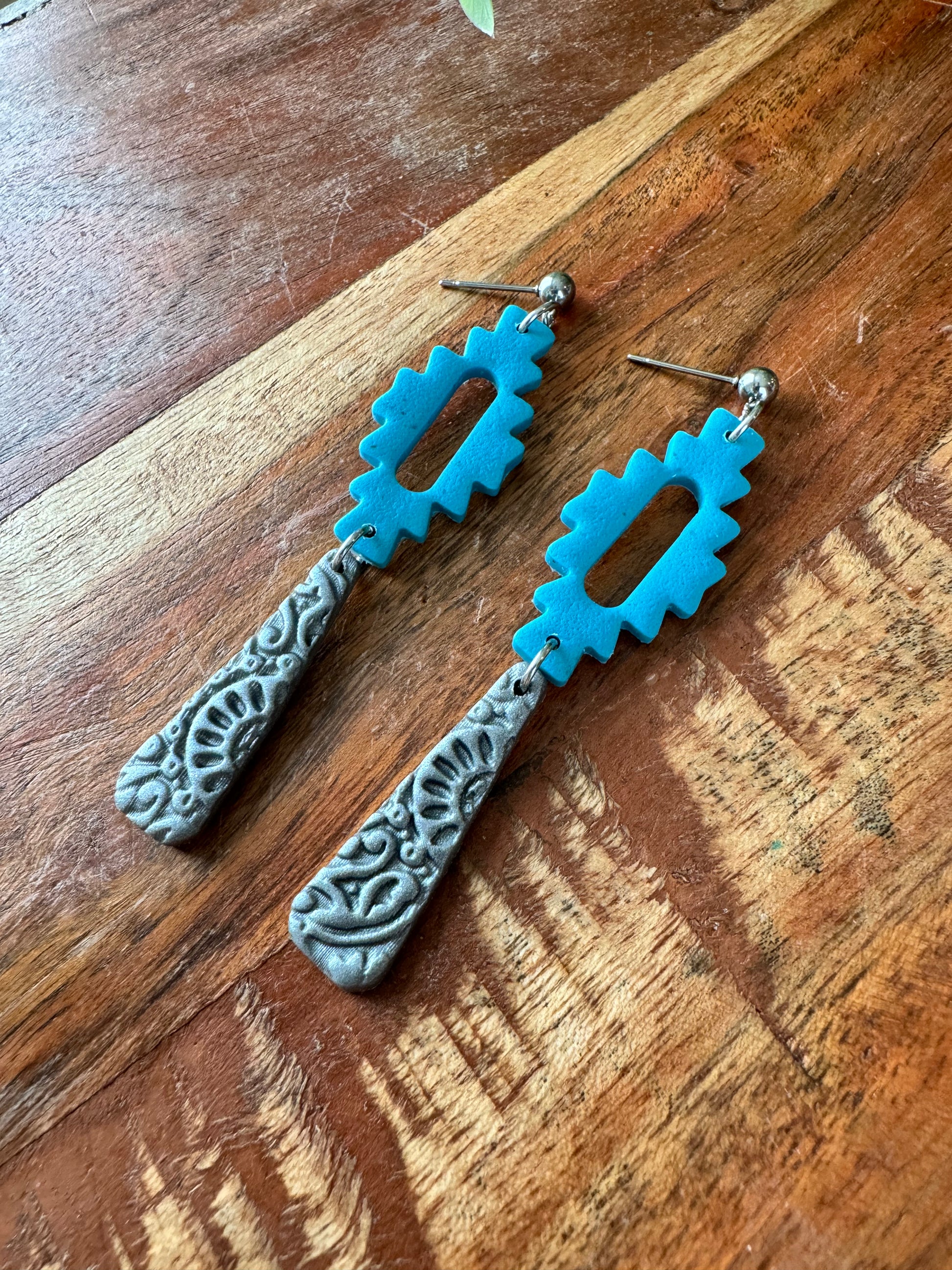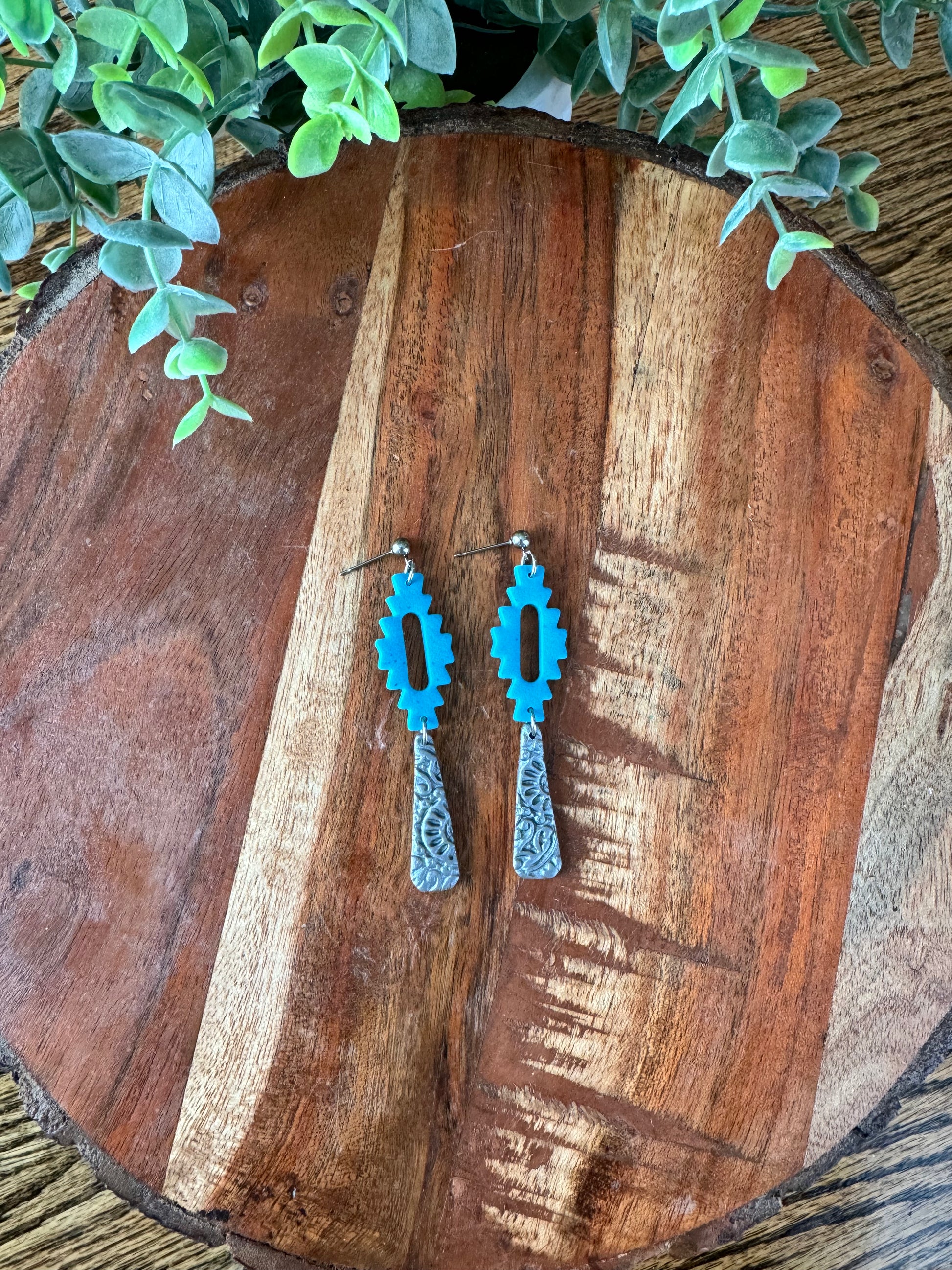 Beautiful western style polymer clay earrings. They measure about 2.75” in length. They are on stainless steel ball posts.