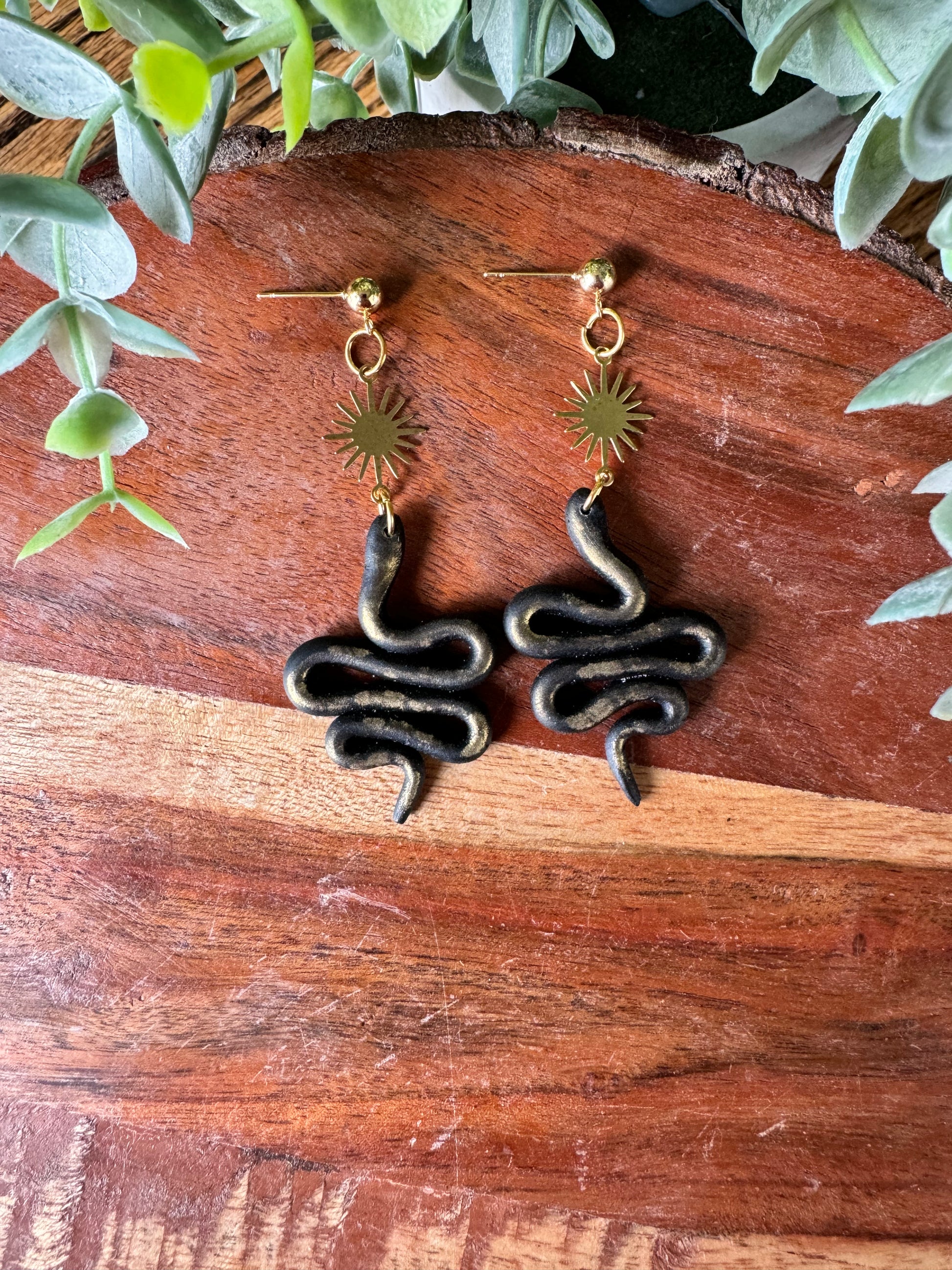 Off-white or black and gold snake earrings with a brass sun charm. On gold plated steel ball posts. About 2.25 inches long.
