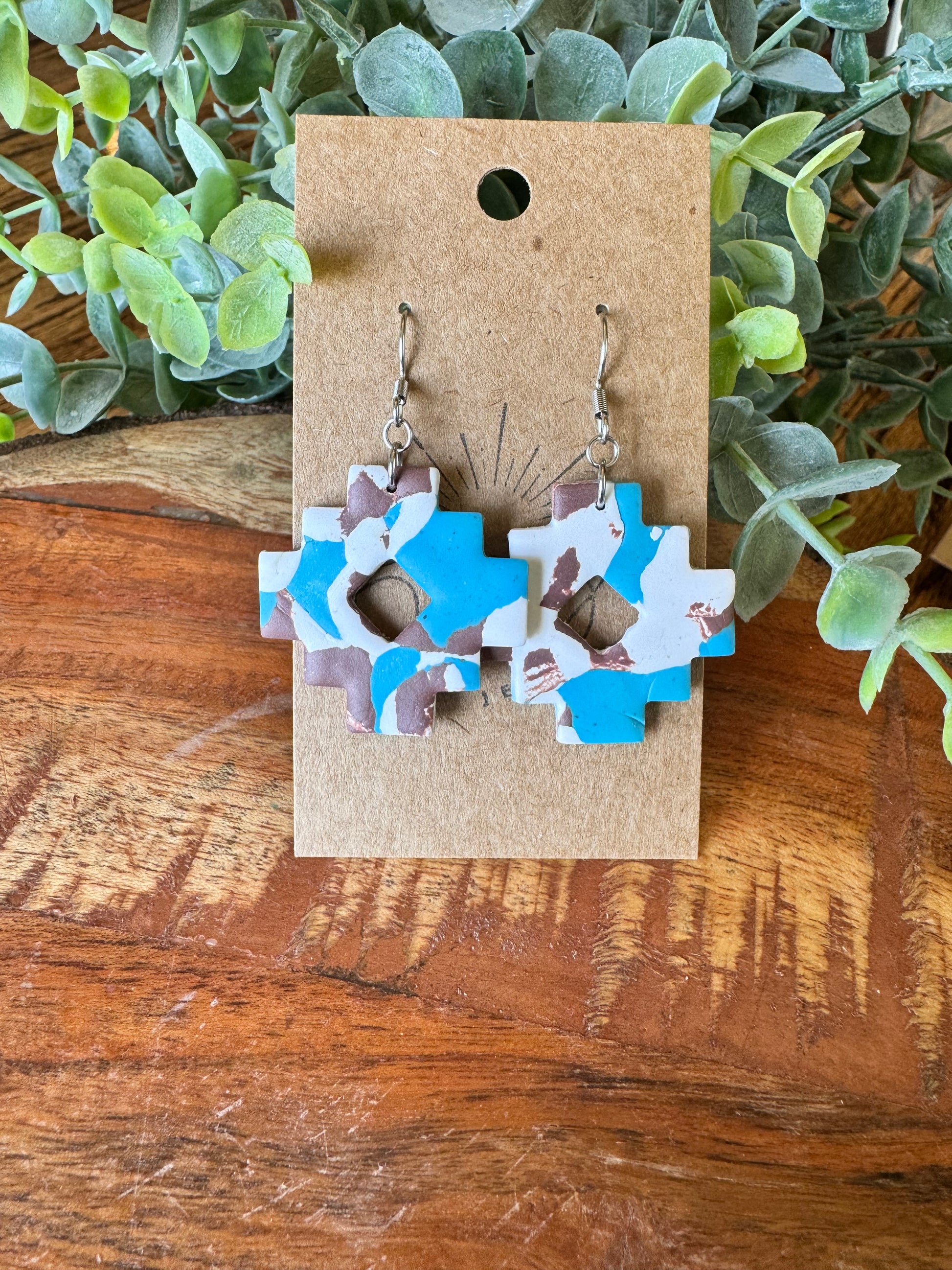 Aztec shape dangles in brown cow print and turquoise. On stainless steel earring hooks.