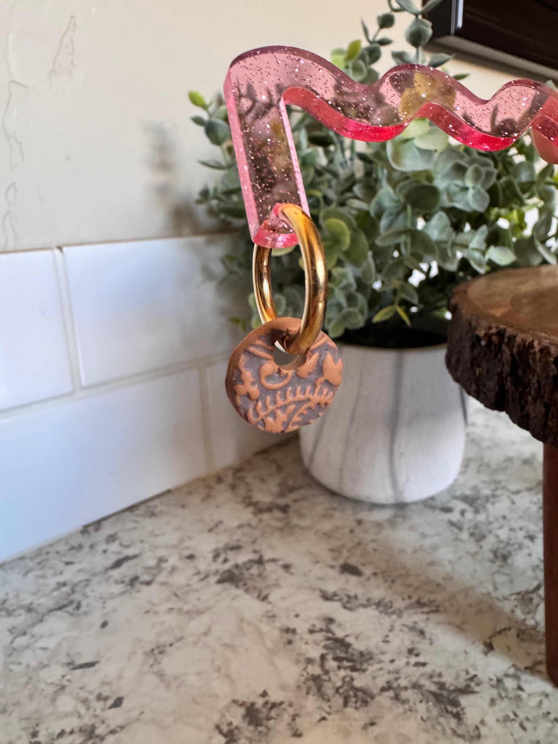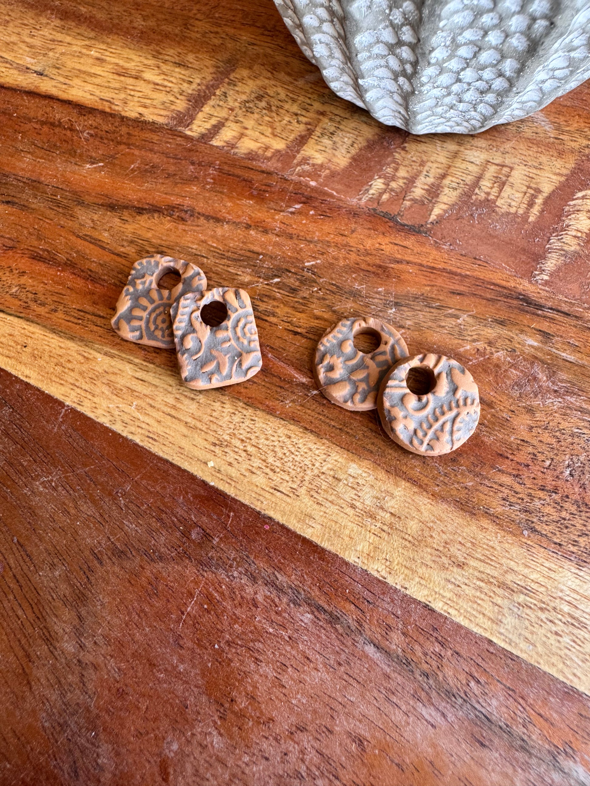 Polymer clay charms made for leverback hoop earrings! Earrings are sold separately. These tooled leather style charms are about 17mm in size.